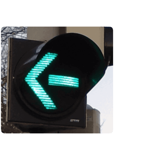 Cette flèche verte orientée vers la gauche est placée individuellement à la sortie d’une intersection. Elle signifie que la circulation en sens inverse – sur la voie que les conducteurs tournant à gauche sont en train de quitter – est arrêtée par un feu rouge afin de faciliter le dégagement de l’intersection. Cependant, il faut toujours s’attendre à ce que des piétons et/ou des cyclistes traversent la rue dans laquelle tu veux t’engager. Il faut donc faire preuve de vigilance.